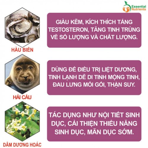 Bổ sung dưỡng chất từ hàu, hỗ trợ bổ thận tráng dương, mạnh gân cốt, giúp tăng cường sinh lực và khả năng sinh lý nam.