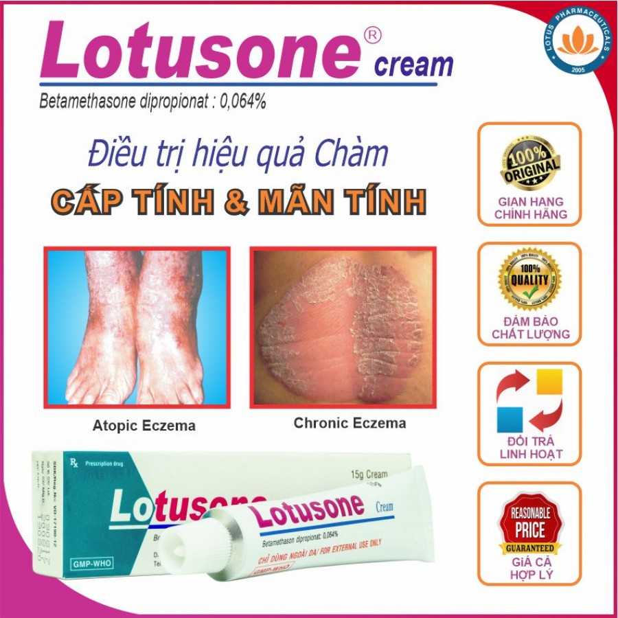 Lotusone có chứa hoạt chất Betamethasone. Thuốc được sử dụng để điều trị các bệnh da liễu có đáp ứng với corticosteroid như vẩy nến, chàm cấp và mãn tính, viêm da tiếp xúc, viêm da tróc vảy,…