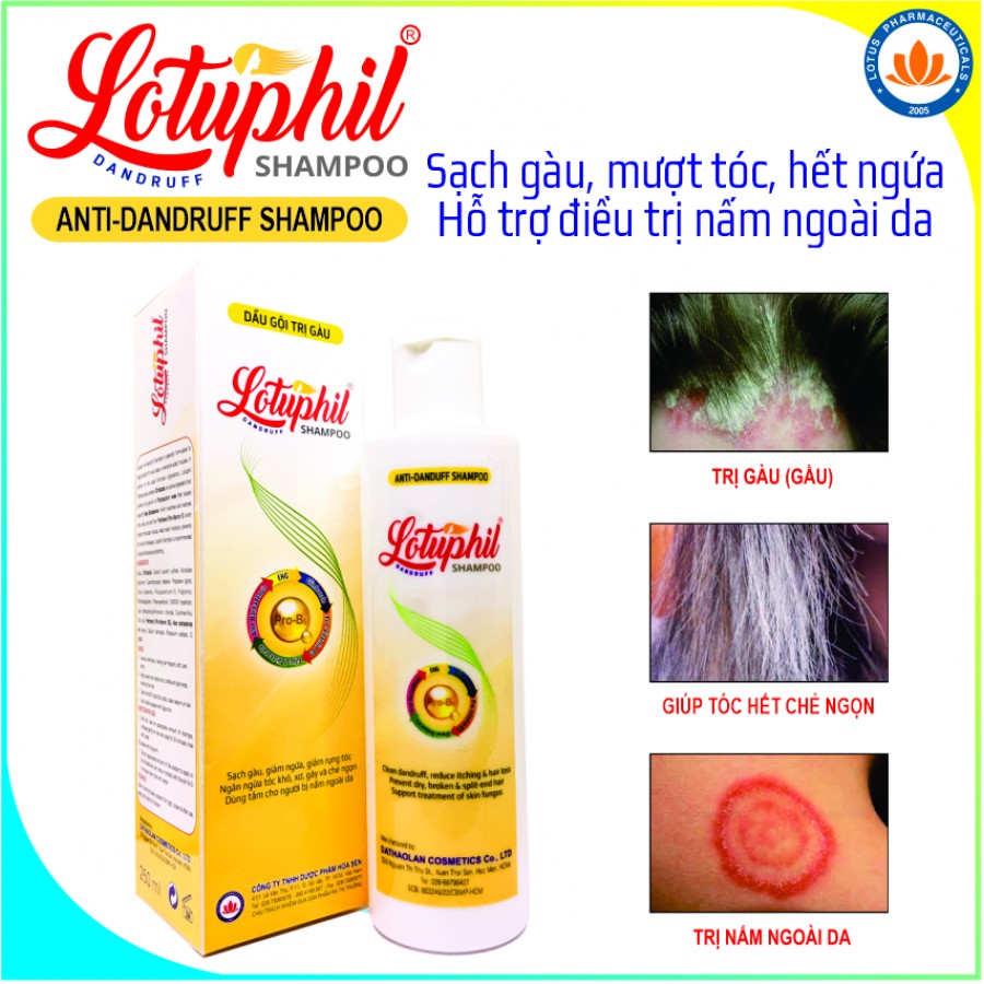 Lotuphil Shampoo dầu gội trị (gàu) gầu được bào chế đặc biệt cho các trường hợp gàu trên tóc và da đầu, hoặc niêm mạc da đầu nhạy cảm. Ngoài những thành phần thông thường của dầu gội, Lotuphil Shampoo còn có chứa hoạt chất Climbazole có tác dụng ngăn ngừa sự phát triển của Pityrosporum ovale một tác nhân gây gàu, Aloe Barbadensis (Lô hội) giúp nuôi dưỡng và phục hồi mái tóc bóng mượt, mềm mại, Panthenol (Pro-Vitamin 5) bảo vệ niêm mạc da đầu, giúp giữ ẩm, ngăn ngừ tóc khô và gãy rụng. Lotuphil Shampoo được khuyên dùng trong tắm gội hàng ngày.